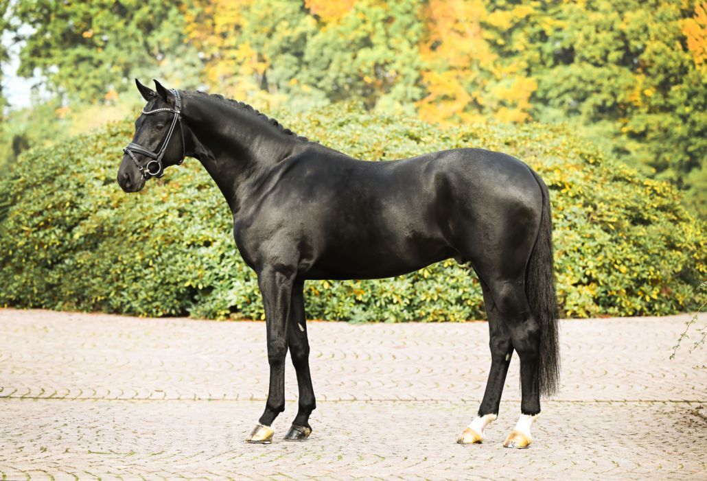 Total McLaren ist eine Entdeckung der niederländischen Körung in ´s-Hertogenbosch/NED, wo der bildschöne Rappe alle Blicke auf sich lenkte. Anschließend wurde er auch in Dänemark gekört und absolvierte dort seine HLP mit erwarteten Höhepunkten hinsichtlich Grundgangarten und Rittigkeit mit gesamt 807,0 Punkten. Unter Jana Schrödter sicherte er sich 2021 Bronze beim Reitpferde-Bundeschampionat – mit der Traumnote 10 für den Galopp. 2022 gab es mit Leonie Richter im Sattel erneut Bronze – diesmal bei Bundeschampionat der fünfjährigen Dressurpferde (8,8).
